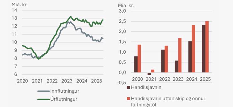 Frá juli 2024 til juni 2025 var avlopið á handilsjavnanum 2,3 mia. kr. og tað var 2,5 mia. kr., um innflutningurin av skipum og øðrum stórum flutningstólum ikki verður tikin við.