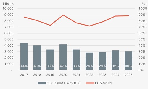 Kelda: Landsbanki Føroya, Gjaldstovan, ALS, AMEG, Eystur- og Sandoyartunlar og Hagstova Føroya, Búskaparráðið. Viðm. BTÚ er uppgjørt frá 2017 til 2023, 2024 og 2025 er meting hjá Búskaparráðnum. EGS-skuldin í 2024 og 2025 er meting hjá Landsbanka Føroya.