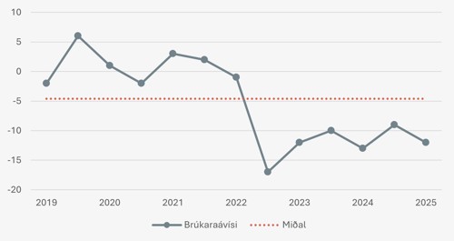 Vísitalið hevur fyrr verið enn lægri enn tað er í løtuni; í fíggjarkreppuni í 2008 var vísitalið -37. Samanumtikið hevur brúkaraávísin verið undir miðal síðani mitt í 2022, ið millum annað kann síggjast í ljósinum av stórum príshækkingum á nýtsluvørunum hjá húsarhaldunum og einari spentari geopolitiskari støðu, ið hevur stórar óvissur knýttar at sær.