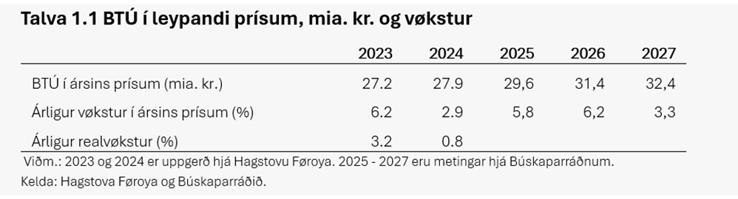 Búskaparráðið hevur í samstarvi við Hagstovu Føroya mett um vøksturin í BTÚ fyri árini 2025 – 2027. Vøksturin í BTÚ í leypandi prísum er mettur at vera ávikavist 5,8% í 2025, 6,2% 2026 og 3,3% í 2027, sí talvu 1 niðanfyri.