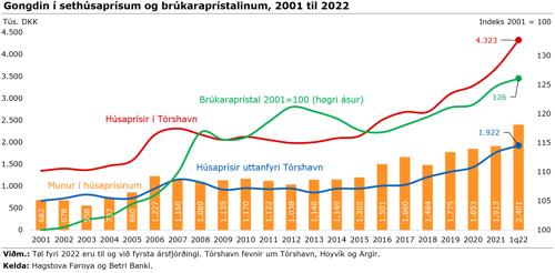 Enn er bústaðartrot, serliga í miðstaðarøkinum. Tað sæst aftur á prísvøkstrinum á býlum, sum myndin niðanfyri vísir. Myndin vísir gongdina í sethúsaprísum, sum eru skrásettir av Betri Banka fyri tíðarskeiðið 2001 til 2021, harafturat er fyrsti ársfjórðingur 2022 eisini við í myndini. Miðalprísurin í Tórshavn hevur verið vaksandi síðani 2012. Síðan 2017 tykist vøksturin í sethúsaprísinum uttanfyri miðstaðarøkið somuleiðis at vera øktur. Miðalprísurin á sethúsum uttanfyri Tórshavn var í fyrsta ársfjórðingi 2022 1,9 mió. kr. og í Tórshavn 4,3 mió. kr.