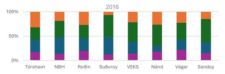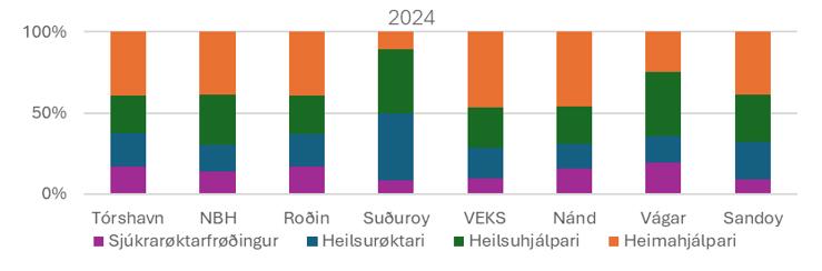 Býtið millum ymsu sløgini av røktarstarvsfólkunum er ymisk fyri eldrasamstørvini, sí mynd 2. Ein stórur partur av starvsfólkunum í Suðuroynni er útlærdur sum heilsurøktari samanborið við restina av landinum, bæði í 2016 og 2024.