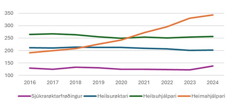 Talið av heimahjálparum er vaksið við 150 ársverkum í árunum 2016 til 2024, meðan talið av heilsurøktarum, heilsuhjálparum og sjúkrarøktarfrøðingum nærum hevur staðið í stað.