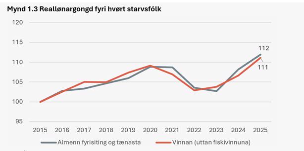 Fallið í reallønini vegna høga inflatión í 2022 og 2023 er innheintað, og reala lønarlagið er í dag eitt vet hægri, enn í 2021.