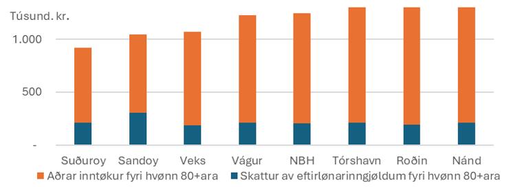 Myndin niðanfyri vísir inntøkurnar í 2024 frá kommunuskatti, felagsskatti, flyting vegna DIS, FAS og frádráttir (reyðu stabbarnir) og skatting av eftirlønarinngjøldum (gráu stabbarnir) hjá kommunum í ymsu eldrasamstørvunum, býtt við talið av borgarum omanfyri 80 ár í økinum. Myndin vísir, at inntøkurnar fyri hvønn íbúgva, sum er 80 ár og eldri, eru lægst í Suðuroy, Sandoy og Veks, meðan inntøkurnar eru hægst í Nánd. Hetta bendir á, at kommunurnar hava ymsar fortreytir at reka eldraøkið.