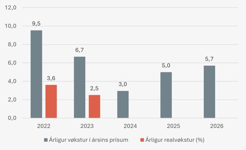 Viðm.: 2022 og 2023 er uppgerð hjá Hagstovu Føroya. 2024, 2025 og 2026 eru metingar hjá Búskaparráðnum.