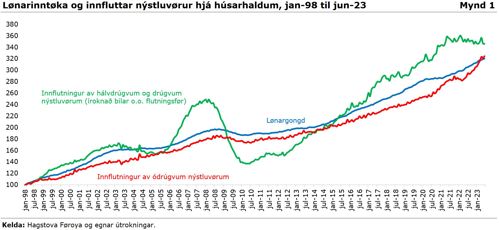 Innflutningurin av ódrúgvum vørum, sum eitt nú eru matvørur, er hinvegin øktur (mynd 1). Hetta merkir, at nýtslumynstrið hjá húsarhaldunum er broytt á tann hátt, at gerandisvørurnar fylla meira enn áður í samlaðu nýtsluni.