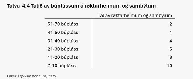 Í Føroyum hava heili 23 av 30 røktarheimum og sambýlum færri enn 30 búpláss, og 10 hava enntá 10 og færri búpláss, sí talvu. Tað er eyðsæð, at við fáum búplássum fyri hvørt røktarheim, verða normeringarnar lutfalsliga høgar og sostatt gerst raksturin fyri hvørt búpláss dýrari. Sí eisini stakdømið.