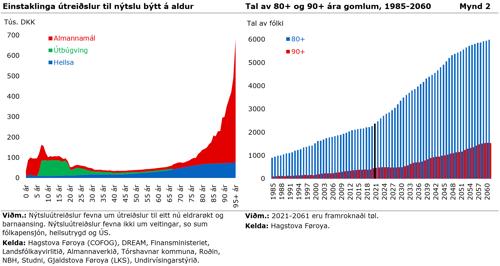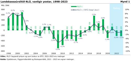 Hóast hesar góðu tíðir, er hall í bæði lands- og kommunukassunum. Við nærum ongum arbeiðsloysi og stórum inntøkuvøkstri eiga almennu kassarnir at hava avlop. At hall verður á fíggjarlógini í 2022 og 2023 er als ikki nóg gott í so góðum búskaparligum tíðum, tí tað bendir á vantandi haldføri tá hugsað verður um komandi avbjóðingarnar við vaksandi útreiðslum til eldraøkið, tað vil siga til pensjónir, eldrarøkt, heilsuøkið við meira, sí mynd 1 og 2.