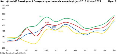 Hagtøl fyri kortnýtsluna hjá føroyingum vísa, at føroyingar hava nýtt meira av peningi í 2022 samanborið við undanfarnu trý árini, sí grønu strikuna í mynd 2, sum alt tíðarskeiðið, við undantakið av januar mánaði, liggur omanfyri hini árini.