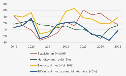 Handilsvinnan er hinvegin meira bjartskygd, enn í undanfarnum kanningum. Handilsvinnan gevur eitt innlit í keypiorkuna hjá húsarhaldum og hjá fyritøkum. Ávísin hjá handilsvinnuni er í seinastu kanning av konjunkturbarometrinum hjá Hagstovuni øktur nógv síðani á sumri 2024; frá 4 til 13.