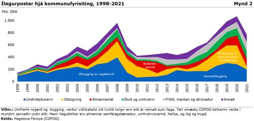 Mynd 2 vísir íløguútreiðslurnar hjá kommunum frá 1998 til 2016 býtt á íløgupostar. Verður samanborið við íløgurnar hjá landsfyrisitingini sæst, at íløguvirksemið hjá kommununum eisini er konjunktur-viðgangandi, og í uppaftur størri mun. Íløguvirksemið hjá kommununum nærum fýrfaldast í árunum 2000 til 2008, men fellur síðani í helvt tá fíggjarkreppan rakar. Í árunum 2006 - 2008 veksur bláa økið, tí tá ger millum annað Tórshavnar kommuna íløgur í vegakervið, og í árunum 2014 og fram fer útbyggingin í Tórshavnar Havn í gongd (bláa økið). Burtursæð frá nøkrum stórum, ítøkiligum íløgum – millum annað Boðanesheimið, Ósaskúlin og skúlarnir á Argjahamri og við Løgmannabreyt – er lítið virksemi fram til 2016, tá íløguvirksemið hjá kommunum aftur økist. Í 2019 var íløguvirksemið hjá kommunum aftur á støði við virksemið undan fíggjarkreppuna.
