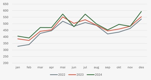 Kortnýtslan hjá føroysku húsarhaldunum var eitt vet hægri í 2024 samanborið við 2023, sí myndina niðanfyri. Gongdin mánað fyri mánað í 2024 var meinlík gongdini í 2022 og 2023, tó undantikið juni mánað, har kortnýtslan var sera lág vegna manglandi vørur í føroysku handlunum, ið stóðst av verkfallinum.
