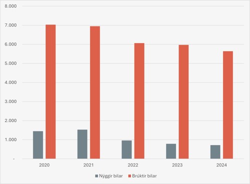 Seinastu trý árini er árliga bilasølan lækkað við ávikavist 17%, 4% og og seinasta árið við 6%, sí eisini myndina niðanfyri. Í 2020 vóru 17% av seldu bilunum nýggir, meðan í 2024 vóru 11% nýggir bilar. Ein størri prosentpartur av bilasøluni er søla av brúktum bilum. Líkt er til, at sama mynstur, sum Búskaparráðið vísti á í Várfrágreiðingin í 2024, heldur fram. Samlað sæð verða færri bilar seldir og ein størri partur av samlaðu bilasøluni er brúktir bilar.