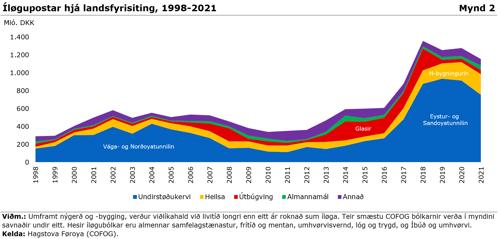 Mynd 2 vísir íløguútreiðslurnar hjá landsfyrisitingini frá 1998 til 2021 býtt á útvaldar íløgupostar. Reyða økið í myndini vísur íløgur í almanna økið, sum ikki fyllir serliga nógv, meðan bláa økið vísir íløgur í undirstøðukervið.