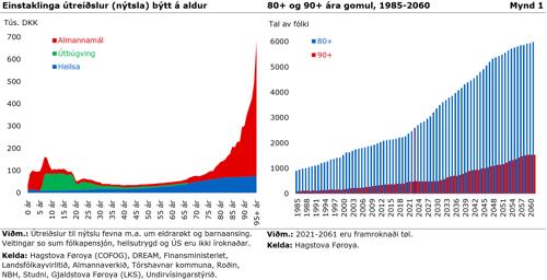 Í mynd 1 vinstrumegin eru almennar útreiðslur til nýtslu (rakstur) av heilsu- undirvísing- og almannamálum býtt á aldursbólkar. Tølini í myndini fevna ikki um almennar útreiðslur til flytingar sum fólkapensjón ella útbúgvingarstuðul (so hesar útreiðslur koma afturat nýtsluni). Myndin vísir, at tað í ungu árunum serliga eru útreiðslur til skúla og barnaansing, sum gera seg galdandi, meðan útreiðslur til heilsuverk og serliga eldrarøkt, veksa í árunum eftir pensjónsaldur. Í myndini sæst, at almennu útreiðslurnar fyri hvønn persón veksa, tá aldurin fer upp um 80 ár og uppaftur meira, tá ið fólk røkka 90 ára aldur og uppeftir. So hvørt sum talið av eldri fólki økist komandi árini, fara almennu útreiðslurnar til vælferðartænastur sum heilsuverk, pensjónur og eldrarøkt, at veksa munandi, so samlaðu almennu útreiðslurnar fara at veksa munandi skjótari enn inntøkurnar.