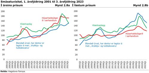 Mynd 2.8 a og b vísir smásøluvísutalið fyri handlar, sum selja ávíkavist mat-, drykkju- og tubbaksvørur, húsarhaldsútgerð, og klædnapløgg. Myndin til vinstru er í ársins prísum, meðan myndin til høgru er í føstum prísum, tað vil siga at mynd 2b vísir seldu mongdina. Á myndunum sæst, at í samsvar við at inflasjónin er økt, er sølan økt í virðum av mati-, drykkju- og tubbaksvøru, men lækkað, tá ið mátað verður í mongdum. Tað merkir, at húsarhaldini brúka fleiri krónur, men fáa minni fyri peningin, tá ið tey keypa mat- og drykkjuvørur, enn áðrenn inflasjónin byrjaði at hækka. Handilsvinnan boðar frá, at nýtslumynstrið hjá brúkarunum er broytt; tey keypa í størri mun lágprísvørur og í minni mun eitt nú vistfrøðiligar vørur.