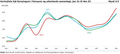 Húsarhaldini hava brúkt fleiri krónur og oyru í 2023 enn undanfarin ár, men kortnýtslan frároknað prísvøkstur vísir, at nýtslan hjá húsarhaldunum var lægri í seinna hálvári 2022 og 2023, enn í sama tíðarskeiði í 2021, ið merkir, at minni fæst fyri pengarnar, sí mynd 2.5.