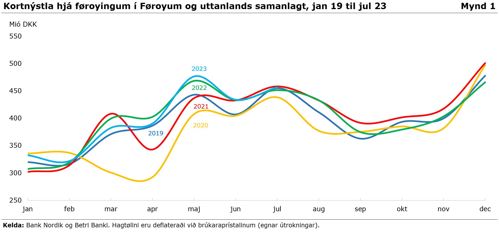 Tøl fyri kortnýtsluna hjá føroyingum uttanlands vísa hinvegin, at nýtslan hjá húsarhaldunum í útlondum hevur verið eins stór á sumri 2023, sum í fjør, og tað bendir á, at húsarhaldini hava gott treysti hóast alt, sí mynd 2.