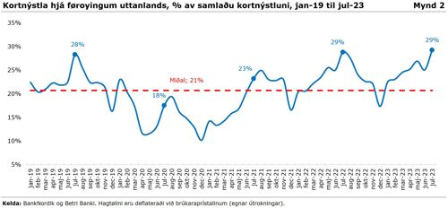 Mynd 1 vísir kortnýtsluna hjá føroyingum. Hagtøl fyri kortnýtslu frároknað prísvøkstur vísa, at føroyingar keyptu minni av vørum og tænastum í seinna hálvári 2022 í mun til seinna hálvár 2021, ið allarhelst skyldast øktu prísirnar. (Reyða strikan 2021, liggur omanfyri grønu strikuna 2022 í mynd 1). Lítil munur er á kortnýtsluni higartil í 2023 (ljósabláa strikan) samanborið við fyrra hálvár 2022 (grøna strikan), ið bendir á, at nýtslan stórt sæð er óbroytt í 2023.