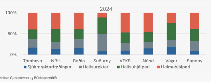 Í Suðuroyar bú- og heimatænastu eru færri heimahjálparar, enn í restini av landinum. Nærum 80% av røktarársverkunum í Suðuroyar bú- og heimatænastu eru antin útlærdir heilsuhjálparar ella heilsurøktarar, sí myndina niðanfyri.