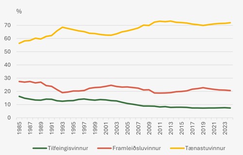Starvsfólkini í Føroyum, eins og í mongum øðrum framkomnum londum, hava við tíðini flutt seg úr tilfeingis- og framleiðsluvinnum yvir í tænastuvinnur, sí myndina niðanfyri.