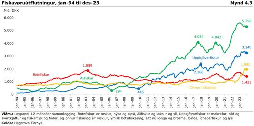 Mynd 4.3 lýsir søguligu gongdina í útflutningsvirðinum av fiskavørum fyri høvuðsbólkarnar alifiskur, uppsjóvarfiskur, botnfiskur og onnur fiskasløg, ið tilsamans so at siga fevna um allan føroyskan vøruútflutning.
