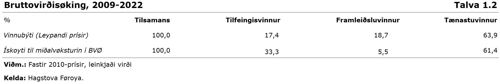 Eftir Covid-19 farsóttina stavaði meginparturin av íkastinum til virðisøkingina í føroyska búskapinum frá tænastuvinnuni. Í 2022 stavaði íkastið til virðisøkingina partvíst frá tænastuvinnuni og partvíst frá tilfeingisvinnuni.