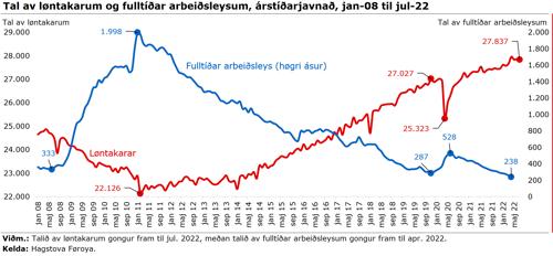 Í juli 2022 vóru 27.837 løntakarar í Føroyum og er tað methøgt. Samstundis er arbeiðsloysið metlágt.