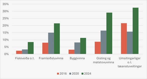 Í 2009 vóru 3% av starvsfólkunum í samlaða búskapinum ikki føroyingar, í 2024 var parturin hækkaður til 8%, ið svarar til á leið 2.300 starvsfólk. Mynd 1 niðanfyri vísir í hvørjum vinnugreinum útlendingarnir arbeiða. Av samlaða talinum av útlendingum arbeiða 31% av teimum í framleiðsluvinnuni, sum serliga fevnir um virking av fiski á flakavirkjum og kryvjivirkum av laksi. 13% arbeiða í byggivinnuni og 12% arbeiða innan gisting og matstovuvinnuna.