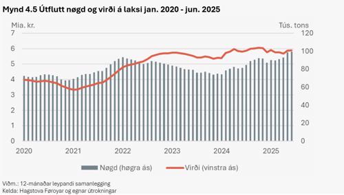 Mynd 1 vísir útfluttu nøgdirnar av laksi, sum 12-mánaðar leypandi samanlegging, umframt útflutningsvirðið. Útflutningsvirðið frá juli 2024 til juni 2025 varð slakar 5,9 mia. kr, meðan tað var góðar 5,8 mia. kr. sama tíðarskeið árið fyri. Hóast útflutningsvirðið er nærum óbroytt í tíðarskeiðinum, er útflutta nøgdin nógv økt og var frá juli 2024 til juni 2025 sløk 100.000 tons. Tað er ein vøkstur á 22% samanborið við sama tíðarskeið árið fyri. Tað eru sostatt veksandi nøgdirnar, sum halda virðinum á laksaútflutningunum uppi, meðan lági prísurin togar niður.